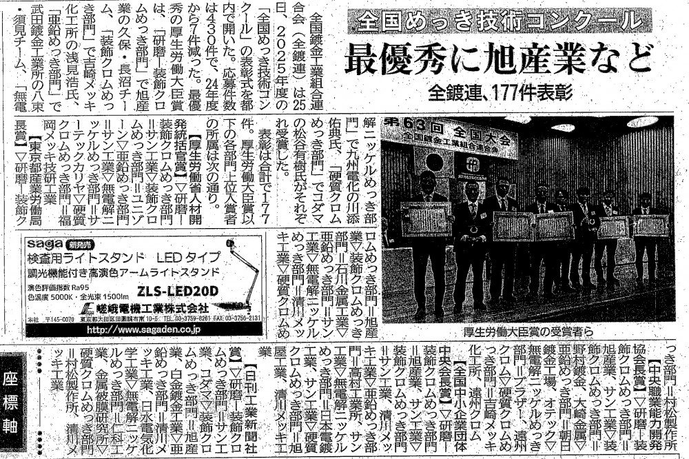 全国めっき技術コンクール【無電解ニッケルめっき部門】厚生労働大臣賞(全国1位)受賞